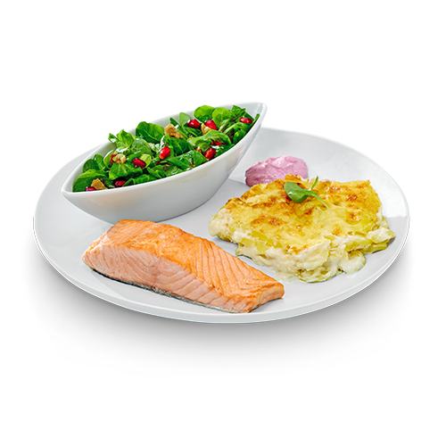 Genießt unser saftiges Lachsfilet, frisch vom Grill, kombiniert mit einem cremigen Kartoffelgratin, frischem Feldsalat mit Granatapfel- und Walnusskernen. Verfeinert wird das Gericht durch eine aromatische Preiselbeer-Meerrettich-Sauce, die dem Ganzen eine aromatische Note verleiht.