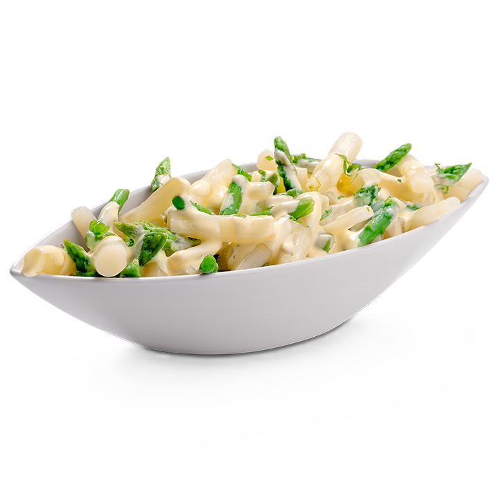 Geschnittener weißer Spargel und grüne Spargelstücke in einer feinen Cremesauce, mit Kräutern verfeinert.